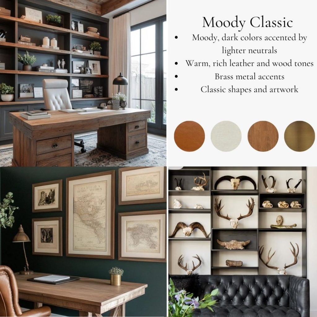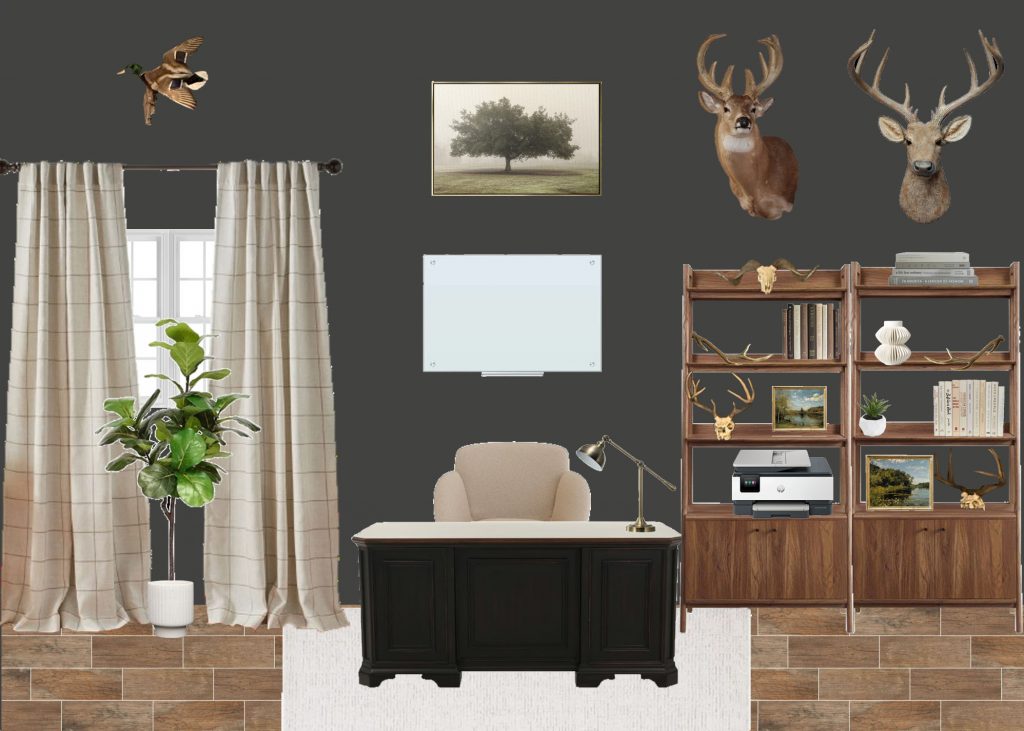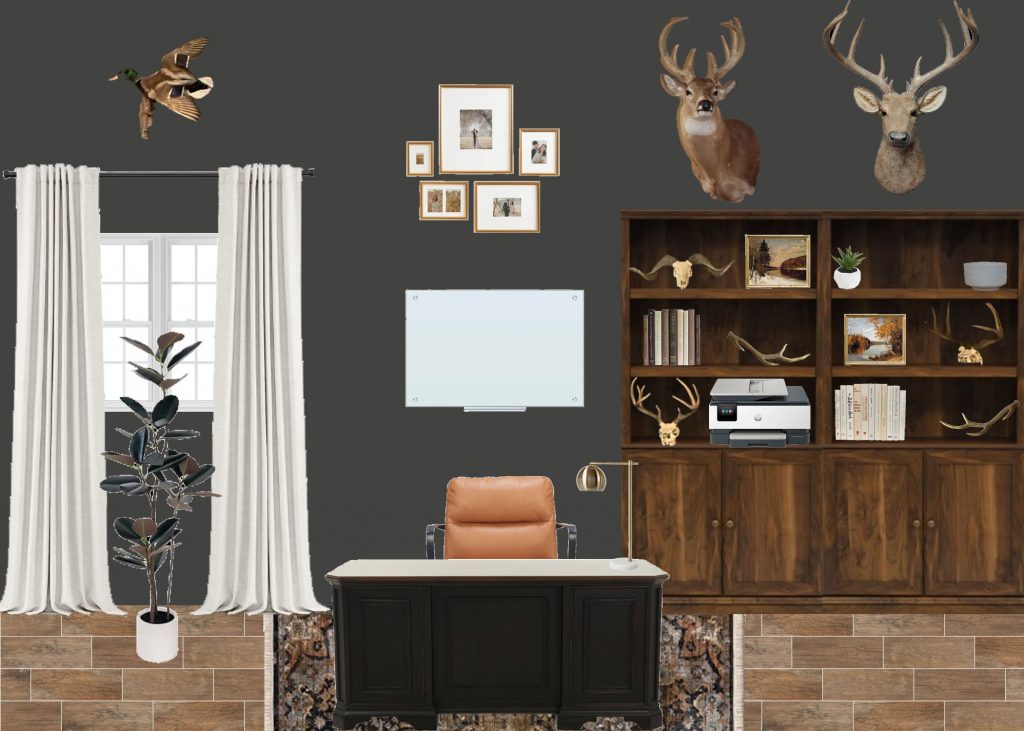 Allison talked Whitney through the pros and cons of each, explaining how the textures, tones, and materials would work with their existing pieces. The goal was never to erase what they had, but to build around it — to let the dark wall color, the sturdy desk, and even the mounted trophies find their place in a more cohesive story.