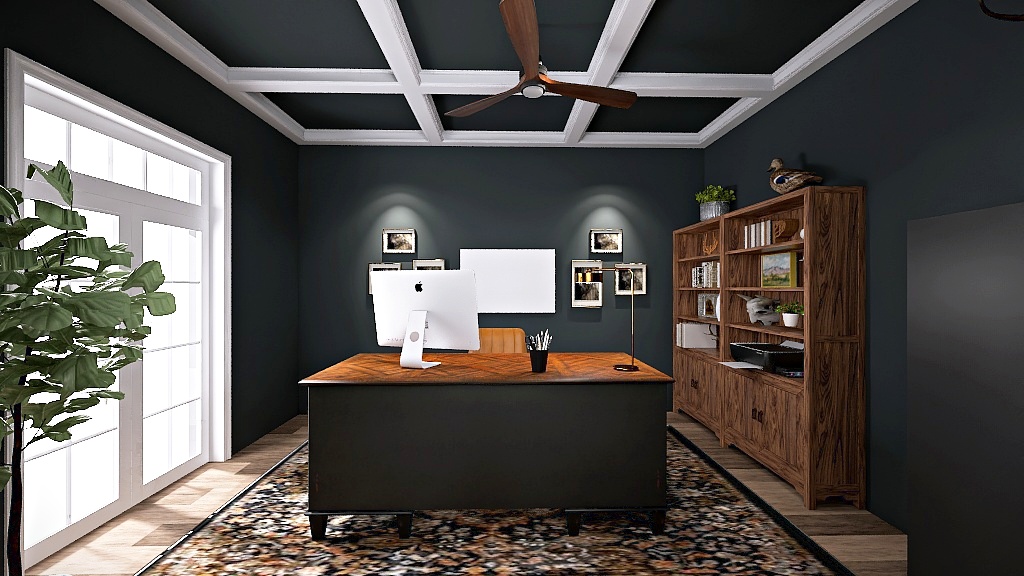 Concept 1 leaned into depth and warmth — walnut bookcases, brass lighting, and a richly patterned rug that anchored the dark walls. It felt classic and confident, a natural extension of the couple’s taste.